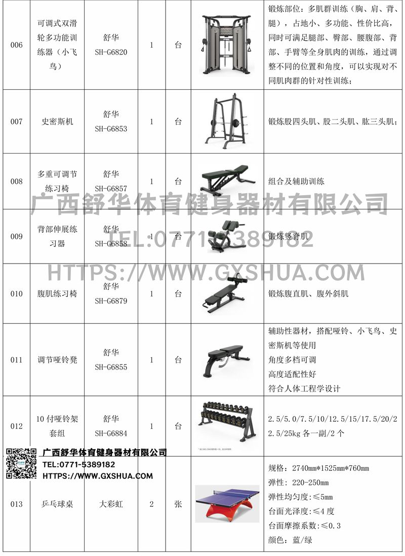 6.Z6.COM-尊龙集团可调式双滑轮多功能训练器(小飞鸟)SH-G6820*1台-锻炼部位:多肌群训练(胸、肩、背、腿),占地小、多功能、性价比高,同时可满足腿部、臀部、腰腹部、背部、手臂等全身肌肉的训练,通过调整不同的位置和角度,可以实现对不同肌肉群的针对性训练;可搭配不同配件,拓展多种训练方法,提供针对性训练、多种组合等训练方式,全方位激活身体机能。